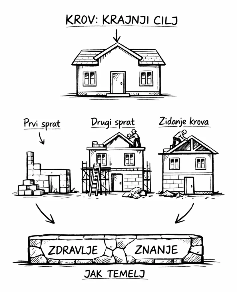 Temelj - osnova koja drži tvoj proces da bi i kada staviš krov, to sve moglo da stoji 100+ godina, bez temelja i da uspeš da staviš krov, kuća pada (vraćaš kilograme nazad, sav trud se ruši).